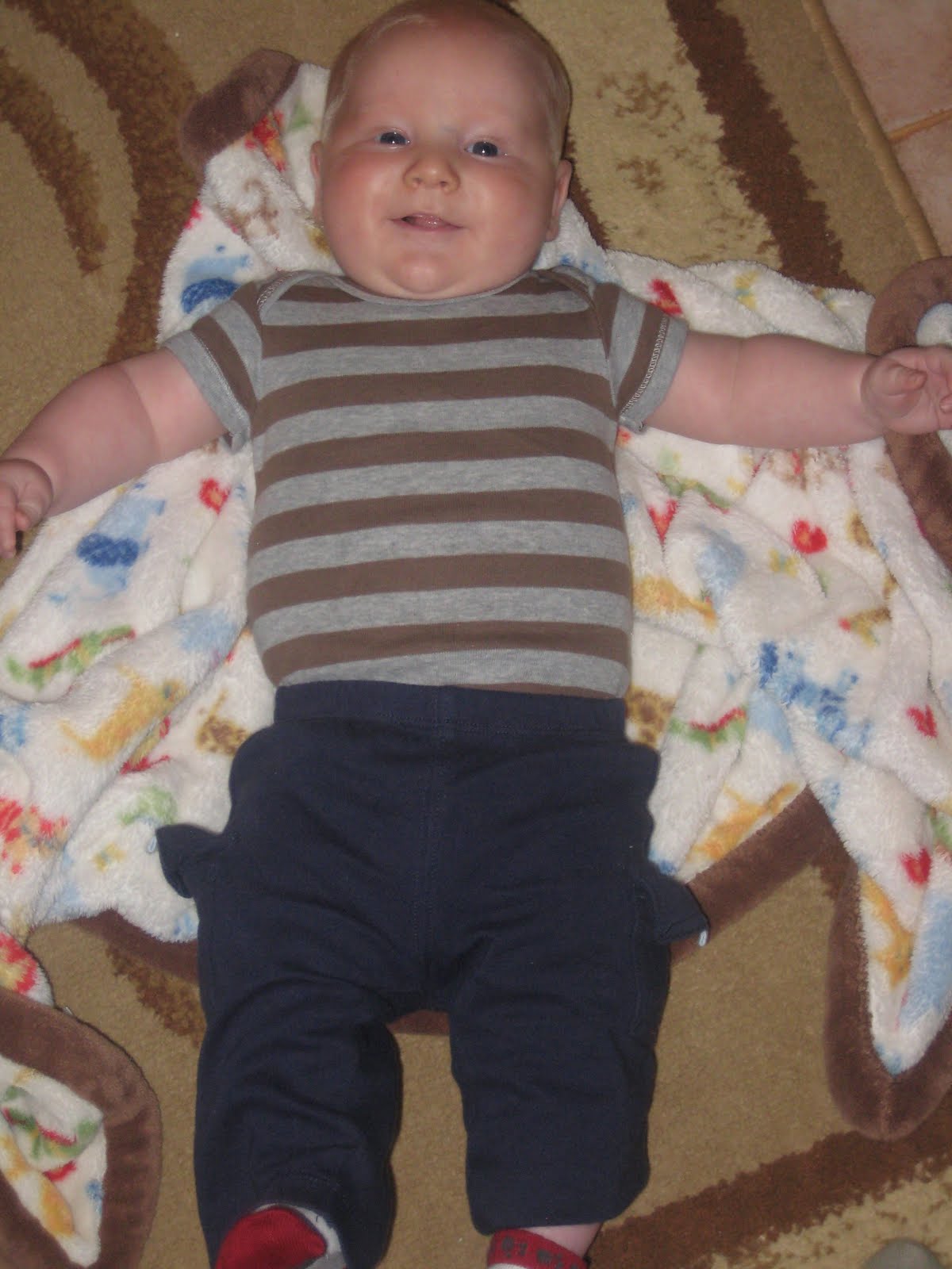 We wanted to show some pics of Samuel. They aren't in any particular order but just to give an idea of how he is growing. As of yesterday he weighed 22 pounds at about 4 1/2 months.